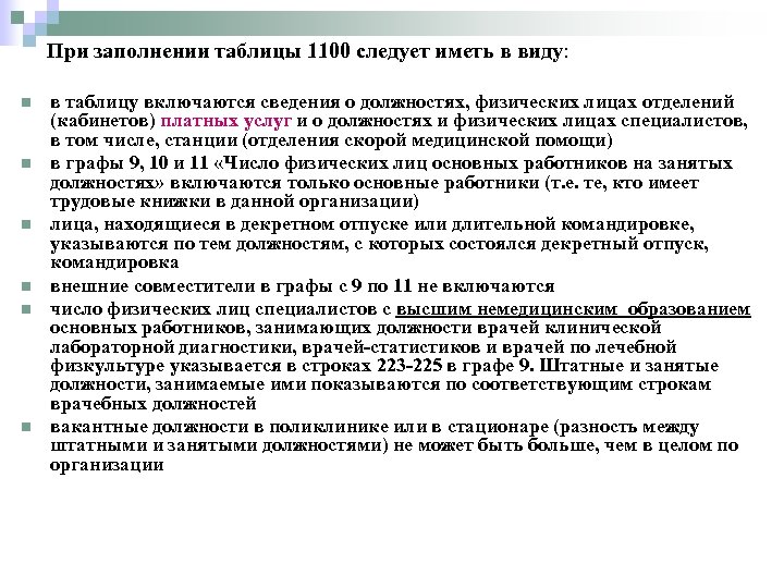 При заполнении таблицы 1100 следует иметь в виду: n n n в таблицу включаются сведения о должностях, физических лицах отделений (кабинетов) платных услуг и о должностях и физических лицах специалистов, в том числе, станции (отделения скорой медицинской помощи) в графы 9, 10 и 11 «Число физических лиц основных работников на занятых должностях» включаются только основные работники (т. е. те, кто имеет трудовые книжки в данной организации) лица, находящиеся в декретном отпуске или длительной командировке, указываются по тем должностям, с которых состоялся декретный отпуск, командировка внешние совместители в графы с 9 по 11 не включаются число физических лиц специалистов с высшим немедицинским образованием основных работников, занимающих должности врачей клинической лабораторной диагностики, врачей-статистиков и врачей по лечебной физкультуре указывается в строках 223 -225 в графе 9. Штатные и занятые должности, занимаемые ими показываются по соответствующим строкам врачебных должностей вакантные должности в поликлинике или в стационаре (разность между штатными и занятыми должностями) не может быть больше, чем в целом по организации