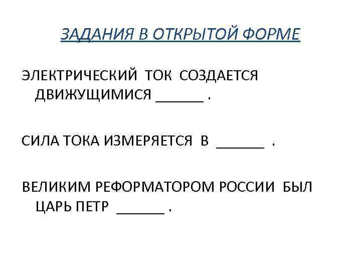ЗАДАНИЯ В ОТКРЫТОЙ ФОРМЕ ЭЛЕКТРИЧЕСКИЙ ТОК СОЗДАЕТСЯ ДВИЖУЩИМИСЯ ______. СИЛА ТОКА ИЗМЕРЯЕТСЯ В ______ . ВЕЛИКИМ РЕФОРМАТОРОМ РОССИИ БЫЛ ЦАРЬ ПЕТР ______.