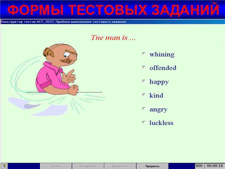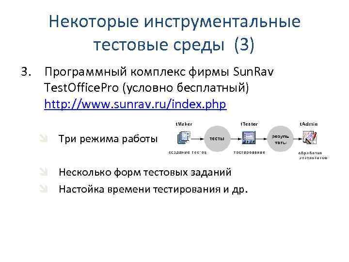 Некоторые инструментальные тестовые среды (3) 3. Программный комплекс фирмы Sun. Rav Test. Office. Pro (условно бесплатный) http: //www. sunrav. ru/index. php î Три режима работы î Несколько форм тестовых заданий î Настойка времени тестирования и др.