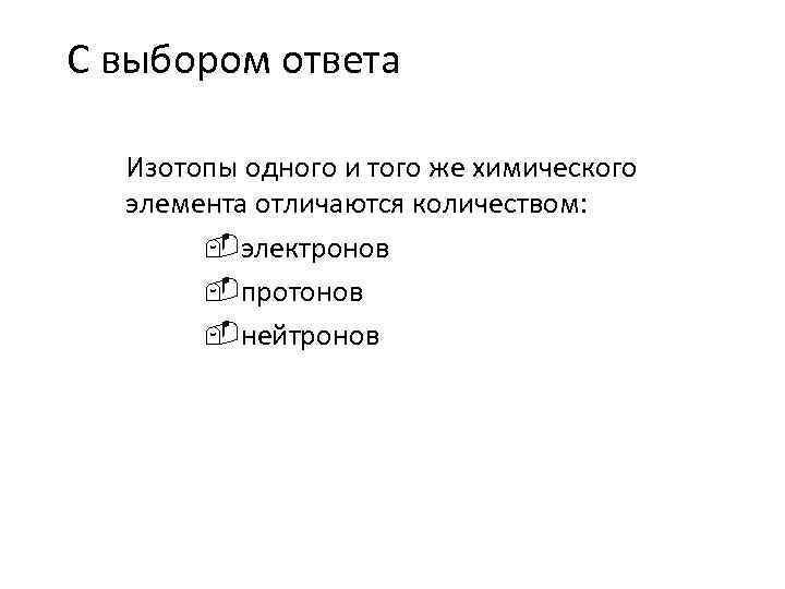 С выбором ответа Изотопы одного и того же химического элемента отличаются количеством: -электронов -протонов -нейтронов