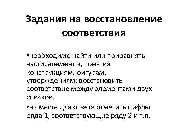 Задания на восстановление соответствия • необходимо найти или приравнять части, элементы, понятия конструкциям, фигурам, утверждениям; восстановить соответствие между элементами двух списков. • на месте для ответа отметить цифры ряда 1, соответствующие ряду 2 и т. п.