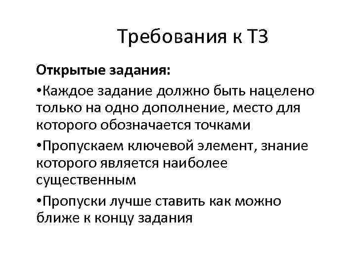 Требования к ТЗ Открытые задания: • Каждое задание должно быть нацелено только на одно дополнение, место для которого обозначается точками • Пропускаем ключевой элемент, знание которого является наиболее существенным • Пропуски лучше ставить как можно ближе к концу задания