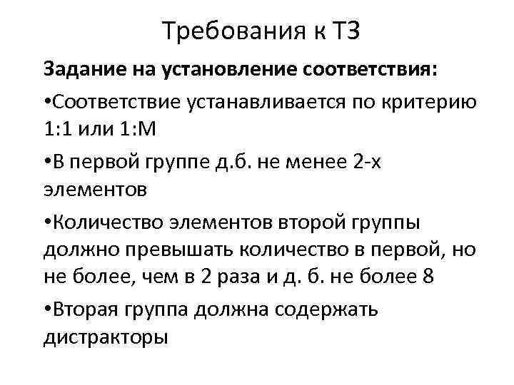 Требования к ТЗ Задание на установление соответствия: • Соответствие устанавливается по критерию 1: 1 или 1: М • В первой группе д. б. не менее 2 -х элементов • Количество элементов второй группы должно превышать количество в первой, но не более, чем в 2 раза и д. б. не более 8 • Вторая группа должна содержать дистракторы
