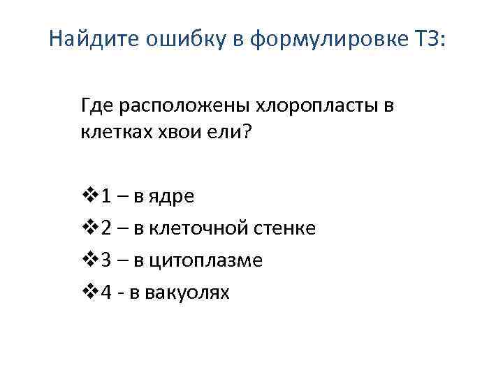 Найдите ошибку в формулировке ТЗ: Где расположены хлоропласты в клетках хвои ели? v 1 – в ядре v 2 – в клеточной стенке v 3 – в цитоплазме v 4 - в вакуолях