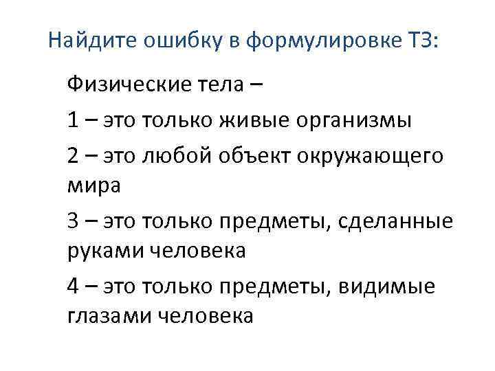 Найдите ошибку в формулировке ТЗ: Физические тела – 1 – это только живые организмы 2 – это любой объект окружающего мира 3 – это только предметы, сделанные руками человека 4 – это только предметы, видимые глазами человека