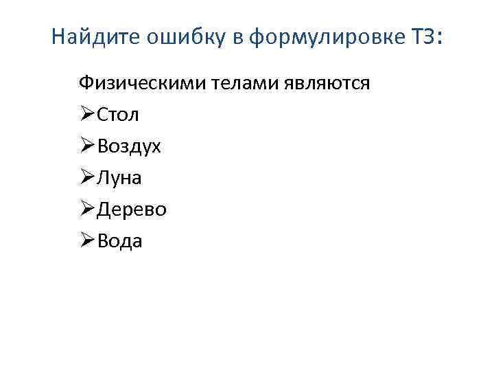 Найдите ошибку в формулировке ТЗ: Физическими телами являются ØСтол ØВоздух ØЛуна ØДерево ØВода