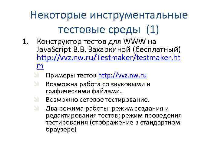 Некоторые инструментальные тестовые среды (1) 1. Конструктор тестов для WWW на Java. Script В. В. Захаркиной (бесплатный) http: //vvz. nw. ru/Testmaker/testmaker. ht m î Примеры тестов http: //vvz. nw. ru î Возможна работа со звуковыми и графическими файлами. î Возможно сетевое тестирование. î Два режима работы: режим создания и редактирования тестов; режим проведения тестирования (отображение в стандартном браузере)