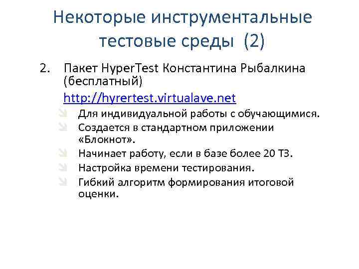 Некоторые инструментальные тестовые среды (2) 2. Пакет Hyper. Test Константина Рыбалкина (бесплатный) http: //hyrertest. virtualave. net î Для индивидуальной работы с обучающимися. î Создается в стандартном приложении «Блокнот» . î Начинает работу, если в базе более 20 ТЗ. î Настройка времени тестирования. î Гибкий алгоритм формирования итоговой оценки.