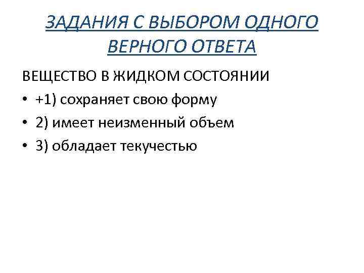 ЗАДАНИЯ С ВЫБОРОМ ОДНОГО ВЕРНОГО ОТВЕТА ВЕЩЕСТВО В ЖИДКОМ СОСТОЯНИИ • +1) сохраняет свою форму • 2) имеет неизменный объем • 3) обладает текучестью