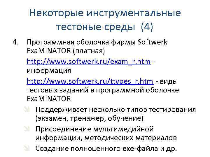 Некоторые инструментальные тестовые среды (4) 4. Программная оболочка фирмы Softwerk Exa. MINATOR (платная) http: //www. softwerk. ru/exam_r. htm - информация http: //www. softwerk. ru/ttypes_r. htm - виды тестовых заданий в программной оболочке Exa. MINATOR î Поддерживает несколько типов тестирования (экзамен, тренажер, обучение) î Присоединение мультимедийной информации, методических материалов î Создание полноценного exe-файла и др.