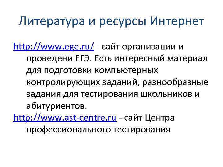 Литература и ресурсы Интернет http: //www. ege. ru/ - сайт организации и проведени ЕГЭ. Есть интересный материал для подготовки компьютерных контролирующих заданий, разнообразные задания для тестирования школьников и абитуриентов. http: //www. ast-centre. ru - сайт Центра профессионального тестирования
