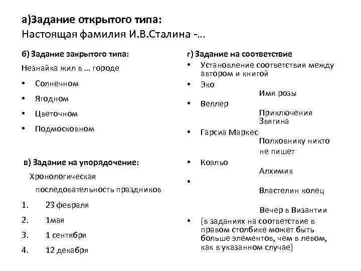 а)Задание открытого типа: Настоящая фамилия И. В. Сталина -… б) Задание закрытого типа: Незнайка жил в … городе • Солнечном • Ягодном • Цветочном • Подмосковном в) Задание на упорядочение: Хронологическая последовательность праздников 1. 23 февраля 2. 1 мая 3. 1 сентября 4. 12 декабря г) Задание на соответствие • Установление соответствия между автором и книгой • Эко Имя розы • Веллер Приключения Звягина • Гарсиа Маркес Полковнику никто не пишет • Коэльо Алхимик • Властелин колец Вечер в Византии • {в заданиях на соответствие в правом столбике может быть больше элементов, чем в левом, как в указанном случае}