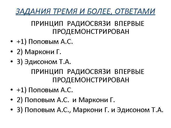 ЗАДАНИЯ ТРЕМЯ И БОЛЕЕ, ОТВЕТАМИ • • • ПРИНЦИП РАДИОСВЯЗИ ВПЕРВЫЕ ПРОДЕМОНСТРИРОВАН +1) Поповым А. С. 2) Маркони Г. 3) Эдисоном Т. А. ПРИНЦИП РАДИОСВЯЗИ ВПЕРВЫЕ ПРОДЕМОНСТРИРОВАН +1) Поповым А. С. 2) Поповым А. С. и Маркони Г. 3) Поповым А. С. , Маркони Г. и Эдисоном Т. А.