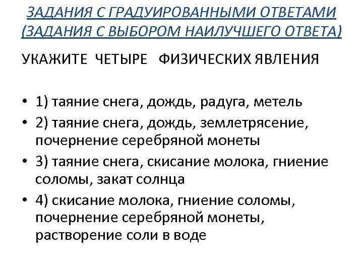 ЗАДАНИЯ С ГРАДУИРОВАННЫМИ ОТВЕТАМИ (ЗАДАНИЯ С ВЫБОРОМ НАИЛУЧШЕГО ОТВЕТА) УКАЖИТЕ ЧЕТЫРЕ ФИЗИЧЕСКИХ ЯВЛЕНИЯ • 1) таяние снега, дождь, радуга, метель • 2) таяние снега, дождь, землетрясение, почернение серебряной монеты • 3) таяние снега, скисание молока, гниение соломы, закат солнца • 4) скисание молока, гниение соломы, почернение серебряной монеты, растворение соли в воде