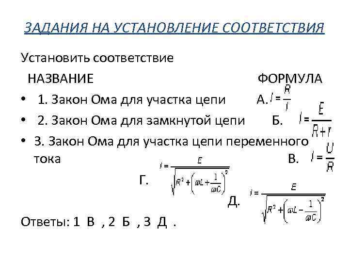 ЗАДАНИЯ НА УСТАНОВЛЕНИЕ СООТВЕТСТВИЯ Установить соответствие НАЗВАНИЕ ФОРМУЛА • 1. Закон Ома для участка цепи А. • 2. Закон Ома для замкнутой цепи Б. • 3. Закон Ома для участка цепи переменного тока В. Г. Д. Ответы: 1 В , 2 Б , 3 Д .