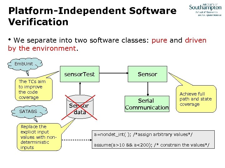 Platform-Independent Software Verification • We separate into two software classes: pure and driven by the environment. Emb. Unit sensor. Test The TCs aim to improve the code coverage SATABS Replace the explicit input values with nondeterministic inputs Sensor data Sensor Serial Communication Achieve full path and state coverage a=nondet_int( ); /*assign arbitrary values*/ assume(a>10 && a<200); /* constrain the values*/