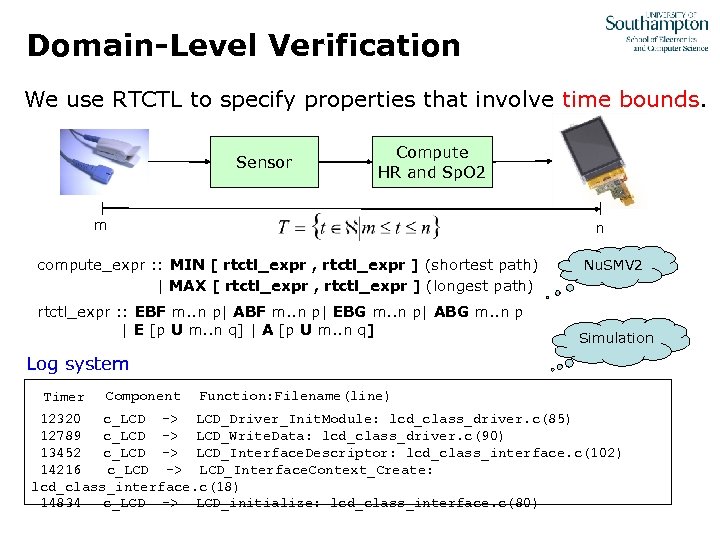 Domain-Level Verification We use RTCTL to specify properties that involve time bounds. Sensor Compute HR and Sp. O 2 m n compute_expr : : MIN [ rtctl_expr , rtctl_expr ] (shortest path) | MAX [ rtctl_expr , rtctl_expr ] (longest path) rtctl_expr : : EBF m. . n p| ABF m. . n p| EBG m. . n p| ABG m. . n p | E [p U m. . n q] | A [p U m. . n q] Nu. SMV 2 Simulation Log system Timer Component Function: Filename(line) 12320 c_LCD -> LCD_Driver_Init. Module: lcd_class_driver. c(85) 12789 c_LCD -> LCD_Write. Data: lcd_class_driver. c(90) 13452 c_LCD -> LCD_Interface. Descriptor: lcd_class_interface. c(102) 14216 c_LCD -> LCD_Interface. Context_Create: lcd_class_interface. c(18) 14834 c_LCD -> LCD_initialize: lcd_class_interface. c(80)