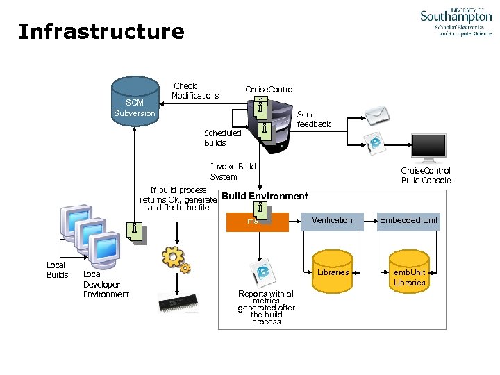 Infrastructure SCM Subversion Check Modifications Cruise. Control Send feedback Scheduled Builds Invoke Build System Cruise. Control Build Console If build process returns OK, generate Build Environment and flash the file Local Builds Local Developer Environment Reports with all metrics generated after the build process Verification Embedded Unit Libraries make emb. Unit Libraries