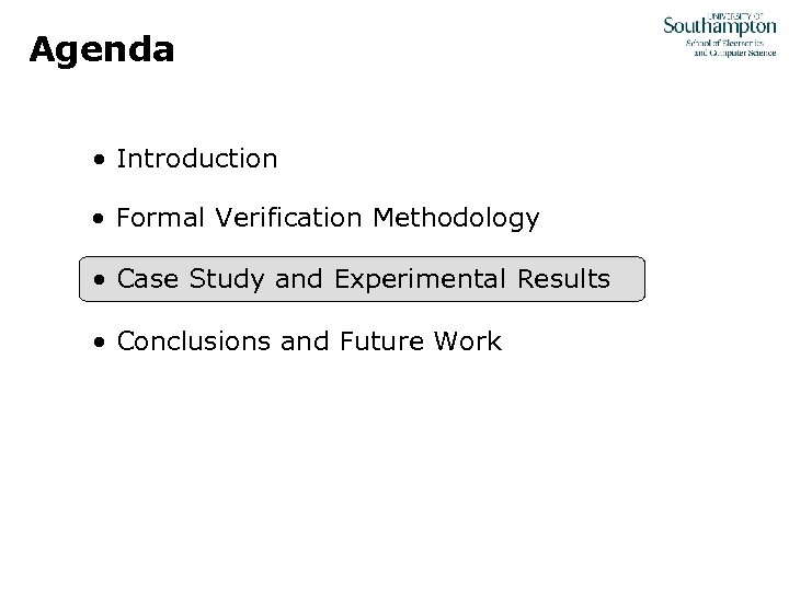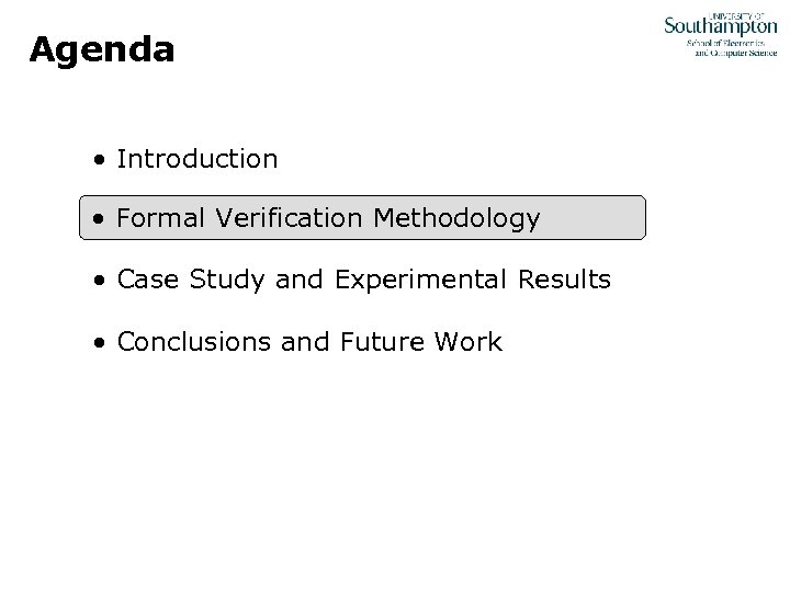 Agenda • Introduction • Formal Verification Methodology • Case Study and Experimental Results • Conclusions and Future Work