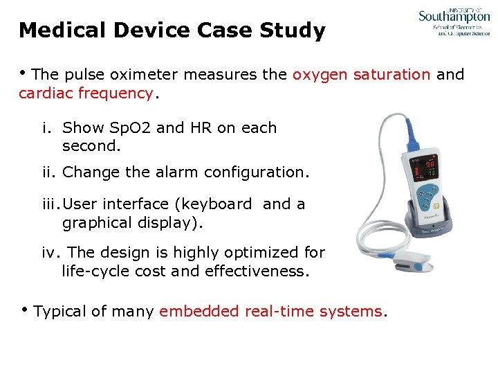 Medical Device Case Study • The pulse oximeter measures the oxygen saturation and cardiac frequency. i. Show Sp. O 2 and HR on each second. ii. Change the alarm configuration. iii. User interface (keyboard and a graphical display). iv. The design is highly optimized for life-cycle cost and effectiveness. • Typical of many embedded real-time systems.
