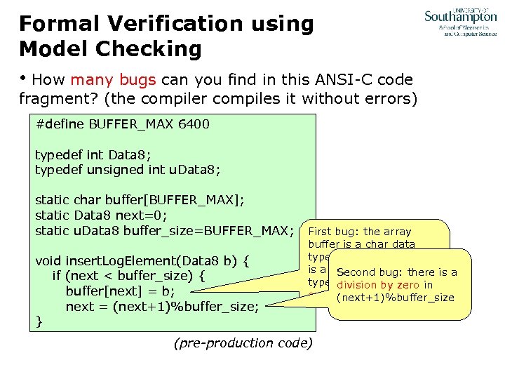 Formal Verification using Model Checking • How many bugs can you find in this ANSI-C code fragment? (the compiler compiles it without errors) #define BUFFER_MAX 6400 typedef int Data 8; typedef unsigned int u. Data 8; static char buffer[BUFFER_MAX]; static Data 8 next=0; static u. Data 8 buffer_size=BUFFER_MAX; void insert. Log. Element(Data 8 b) { if (next < buffer_size) { buffer[next] = b; next = (next+1)%buffer_size; } First bug: the array buffer is a char data type and the element b is a signed integer there is a Second bug: data type (i. e. , typecast in division by zero overflow might occur) (next+1)%buffer_size (pre-production code)