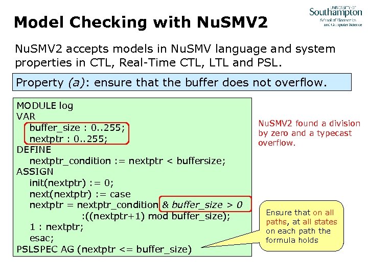 Model Checking with Nu. SMV 2 accepts models in Nu. SMV language and system properties in CTL, Real-Time CTL, LTL and PSL. Property (a): ensure that the buffer does not overflow. MODULE log VAR buffer_size : 0. . 255; nextptr : 0. . 255; DEFINE nextptr_condition : = nextptr < buffersize; ASSIGN init(nextptr) : = 0; next(nextptr) : = case nextptr = nextptr_condition & buffer_size > 0 : ((nextptr+1) mod buffer_size); 1 : nextptr; esac; PSLSPEC AG (nextptr <= buffer_size) Nu. SMV 2 found a division by zero and a typecast overflow. Ensure that on all paths, at all states on each path the formula holds