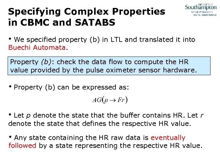 Specifying Complex Properties in CBMC and SATABS • We specified property (b) in LTL and translated it into Buechi Automata. Property (b): check the data flow to compute the HR value provided by the pulse oximeter sensor hardware. • Property (b) can be expressed as: • Let p denote the state that the buffer contains HR. Let r denote the state that defines the respective HR value. • Any state containing the HR raw data is eventually followed by a state representing the respective HR value.