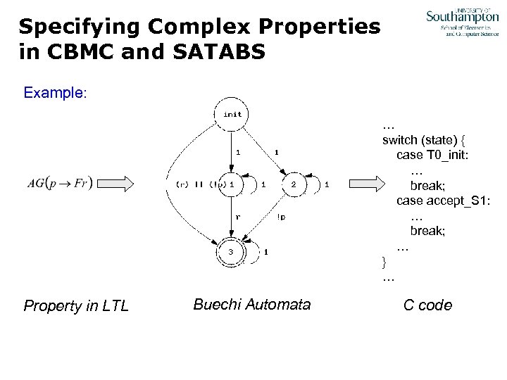 Specifying Complex Properties in CBMC and SATABS Example: … switch (state) { case T 0_init: … break; case accept_S 1: … break; … } … Property in LTL Buechi Automata C code