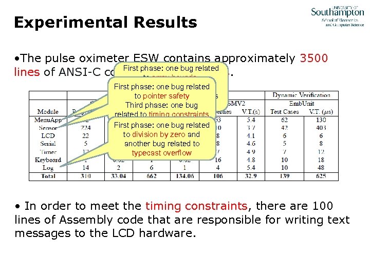 Experimental Results • The pulse oximeter ESW contains approximately 3500 First phase: one bug related lines of ANSI-C code and 80 functions. to array bounds. First Some inconsistencies in phase: one bug related to pointer safety relation to the requirements Third phase: one bug specification related to timing constraints First phase: one bug related to division by zero and another bug related to typecast overflow • In order to meet the timing constraints, there are 100 lines of Assembly code that are responsible for writing text messages to the LCD hardware.