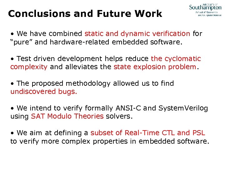 Conclusions and Future Work • We have combined static and dynamic verification for “pure” and hardware-related embedded software. • Test driven development helps reduce the cyclomatic complexity and alleviates the state explosion problem. • The proposed methodology allowed us to find undiscovered bugs. • We intend to verify formally ANSI-C and System. Verilog using SAT Modulo Theories solvers. • We aim at defining a subset of Real-Time CTL and PSL to verify more complex properties in embedded software.