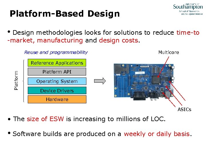 Platform-Based Design • Design methodologies looks for solutions to reduce time-to -market, manufacturing and design costs. Reuse and programmability Multicore Platform Reference Applications Platform API Operating System Device Drivers Hardware ASICs • The size of ESW is increasing to millions of LOC. • Software builds are produced on a weekly or daily basis.