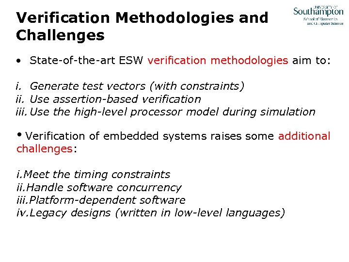 Verification Methodologies and Challenges • State-of-the-art ESW verification methodologies aim to: i. Generate test vectors (with constraints) ii. Use assertion-based verification iii. Use the high-level processor model during simulation • Verification of embedded systems raises some additional challenges: i. Meet the timing constraints ii. Handle software concurrency iii. Platform-dependent software iv. Legacy designs (written in low-level languages)