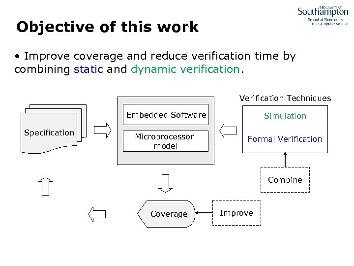 Objective of this work • Improve coverage and reduce verification time by combining static and dynamic verification. Verification Techniques Embedded Software Specification Simulation Microprocessor model Formal Verification Combine Coverage Improve