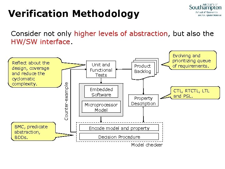 Verification Methodology Consider not only higher levels of abstraction, but also the HW/SW interface. BMC, predicate abstraction, BDDs. Unit and Functional Tests Counter-example Reflect about the design, coverage and reduce the cyclomatic complexity. Embedded Software Microprocessor Model Product Backlog Property Description Encode model and property Decision Procedure Model checker Evolving and prioritizing queue of requirements. CTL, RTCTL, LTL and PSL.