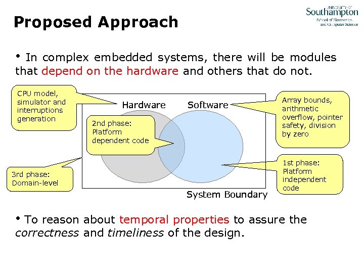 Proposed Approach • In complex embedded systems, there will be modules that depend on the hardware and others that do not. CPU model, simulator and interruptions generation Hardware Software 2 nd phase: Platform dependent code 3 rd phase: Domain-level System Boundary Array bounds, arithmetic overflow, pointer safety, division by zero 1 st phase: Platform independent code • To reason about temporal properties to assure the correctness and timeliness of the design.