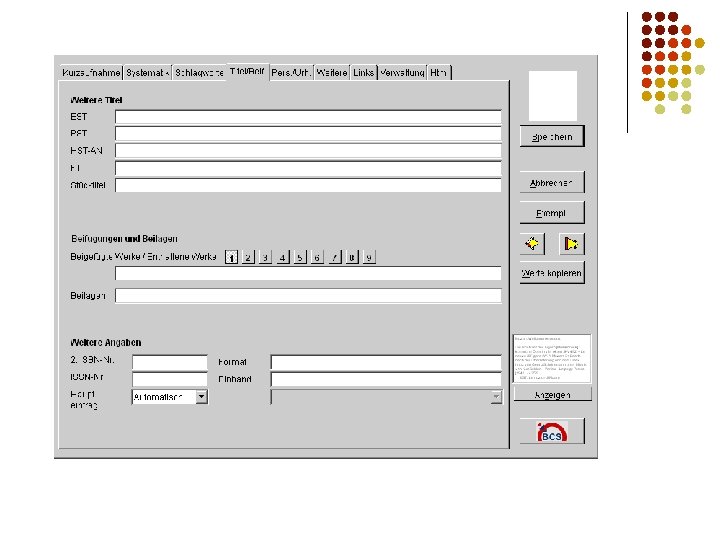 Kollationsvermerk. Physische Beschreibung – § M 151 a (2) l l l Angaben zum technischen System, zum Ländercode, zur Spieldauer und, wenn zweckmäßig, zum Dateiumfang in folgender Reihenfolge und in runden Klammern : a) Technisches System, Aufzeichnungsnorm, wenn sie nicht PAL entspricht (Bildplatten, Tonkassetten, Videobändern, Videokassetten, DVD-Videos); Beispiele: (VHS), (Video 2000, SECAM), (U-matic, NTSC), (DAT) b) Ländercode bei DVD-Videos. - Beispiele: (Ländercode 0), (Ländercode 2) c) Spieldauer aufgerundet auf volle Min. , wenn in der Vorlage genannt, bei Bildtonträgern und Tonbändern Beispiele: 1 Tonband (34 Min. ), 1 Film (85 Min. ), 1 Videokassette (VHS, 97 Min. ) d) der Dateiumfang, wenn in Vorlage genannt ist bei elektronischen Ressourcen. - Beispiele: 1 Diskette (980. 320 Bytes), 1 Diskette (730. 400 Bytes komprimiert) Mehrere Angaben werden durch Komma, Spatium (, ) getrennt: