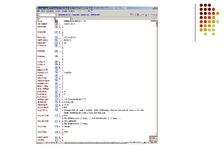 MAB 2 Codierte Felder 050 l l l l 050 Datenträger Codierte Bezeichnung der physischen Form bzw. des Materials, in der die Veröffentlichung vorliegt. Pos. 5 -6 Audiovisuelles Medium/Bildliche Darstellung Die Eingabe in den Pos. 5 -6 bzw. Pos. 8 sind obligat. Tonträger (Auswahl aus der MAB-2 -Dokumentation) aa = CD-DA (Compact Disc Digital Audio, Single Compact Disc) ad = Compact-Cassette ac = Tonband af = Digital Audio Tape (DAT- Cassette) aj = Schallplatte Videoaufnahme ca = Videobandcassette cd = Bildplatte (Videodisc) ce = Anderer Videotyp Pos. 8 Computerdatei a = nicht spezifiziert b = Disketten d = Optische Speicherplatten … Pos. 11 - 13 Anzahl der physischen Einheiten, fakultativ.