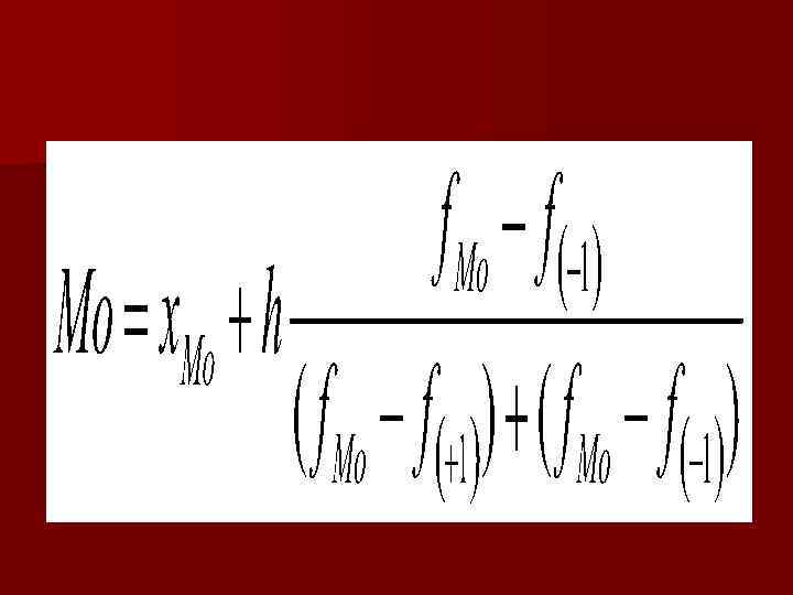 где нижняя граница медианного интервала; h величина интервала; S(-1) накопленная частота интервала, предшествующего медианному; f. Ме частота медианного интервала; n сумма частот или число членов ряда.