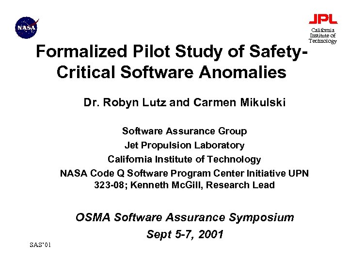 Formalized Pilot Study of Safety. Critical Software Anomalies California Institute of Technology Dr. Robyn Lutz and Carmen Mikulski Software Assurance Group Jet Propulsion Laboratory California Institute of Technology NASA Code Q Software Program Center Initiative UPN 323 -08; Kenneth Mc. Gill, Research Lead OSMA Software Assurance Symposium Sept 5 -7, 2001 SAS’ 01