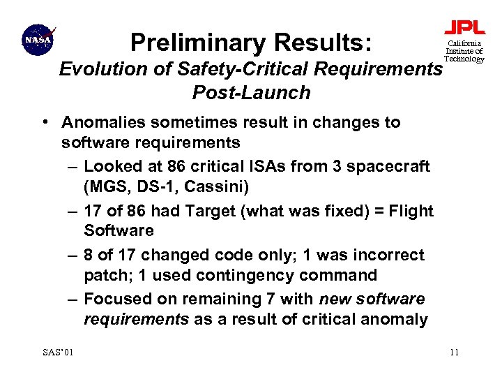 Preliminary Results: Evolution of Safety-Critical Requirements Post-Launch California Institute of Technology • Anomalies sometimes result in changes to software requirements – Looked at 86 critical ISAs from 3 spacecraft (MGS, DS-1, Cassini) – 17 of 86 had Target (what was fixed) = Flight Software – 8 of 17 changed code only; 1 was incorrect patch; 1 used contingency command – Focused on remaining 7 with new software requirements as a result of critical anomaly SAS’ 01 11