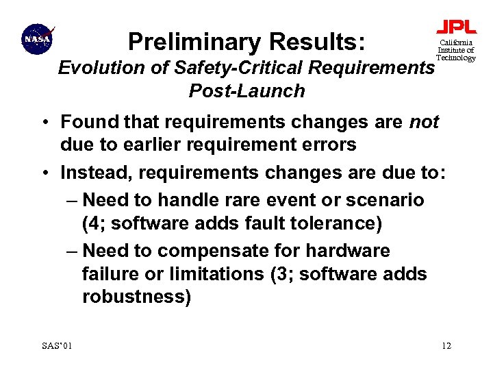 Preliminary Results: Evolution of Safety-Critical Requirements Post-Launch California Institute of Technology • Found that requirements changes are not due to earlier requirement errors • Instead, requirements changes are due to: – Need to handle rare event or scenario (4; software adds fault tolerance) – Need to compensate for hardware failure or limitations (3; software adds robustness) SAS’ 01 12