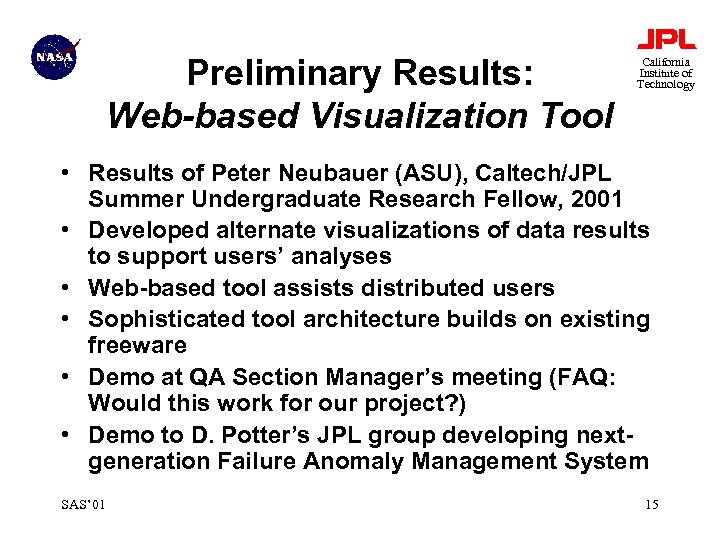 Preliminary Results: Web-based Visualization Tool California Institute of Technology • Results of Peter Neubauer (ASU), Caltech/JPL Summer Undergraduate Research Fellow, 2001 • Developed alternate visualizations of data results to support users’ analyses • Web-based tool assists distributed users • Sophisticated tool architecture builds on existing freeware • Demo at QA Section Manager’s meeting (FAQ: Would this work for our project? ) • Demo to D. Potter’s JPL group developing nextgeneration Failure Anomaly Management System SAS’ 01 15