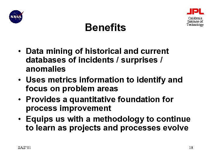 Benefits California Institute of Technology • Data mining of historical and current databases of incidents / surprises / anomalies • Uses metrics information to identify and focus on problem areas • Provides a quantitative foundation for process improvement • Equips us with a methodology to continue to learn as projects and processes evolve SAS’ 01 18