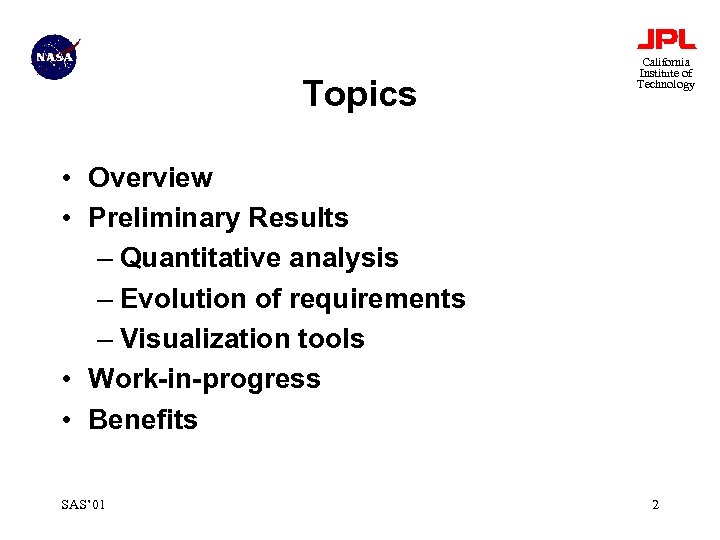 Topics California Institute of Technology • Overview • Preliminary Results – Quantitative analysis – Evolution of requirements – Visualization tools • Work-in-progress • Benefits SAS’ 01 2