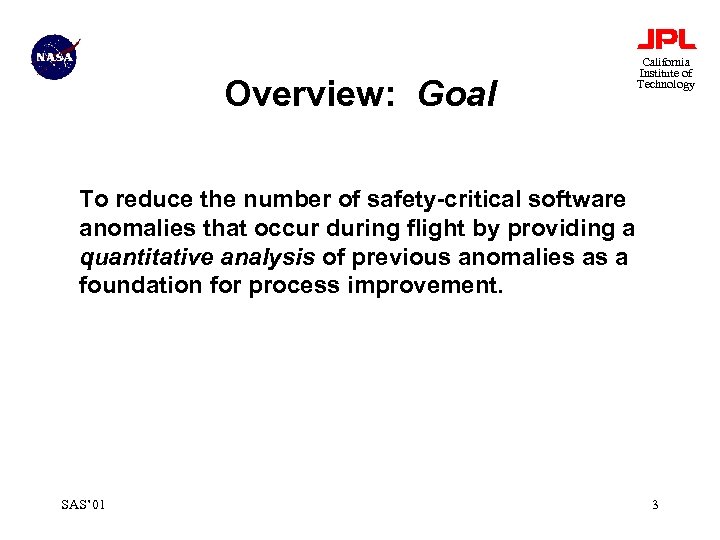 Overview: Goal California Institute of Technology To reduce the number of safety-critical software anomalies that occur during flight by providing a quantitative analysis of previous anomalies as a foundation for process improvement. SAS’ 01 3