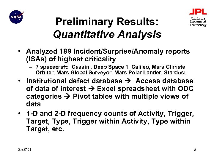 Overview: Status California Institute of Technology • Year 2 of planned 3 -year study Plan Design Conduct Evaluate Use • Adapted ODC categories to operational spacecraft software at JPL: – Activity: what was taking place when anomaly occurred? – Trigger: what was the catalyst? – Target: what was fixed? – Type: what kind of fix was done? SAS’ 01 5