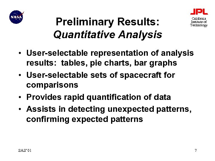 Preliminary Results: Quantitative Analysis California Institute of Technology • Analyzed 189 Incident/Surprise/Anomaly reports (ISAs) of highest criticality – 7 spacecraft: Cassini, Deep Space 1, Galileo, Mars Climate Orbiter, Mars Global Surveyor, Mars Polar Lander, Stardust • Institutional defect database Access database of data of interest Excel spreadsheet with ODC categories Pivot tables with multiple views of data • 1 -D and 2 -D frequency counts of Activity, Trigger, Target, Type, Trigger within Activity, Type within Target, etc. SAS’ 01 6
