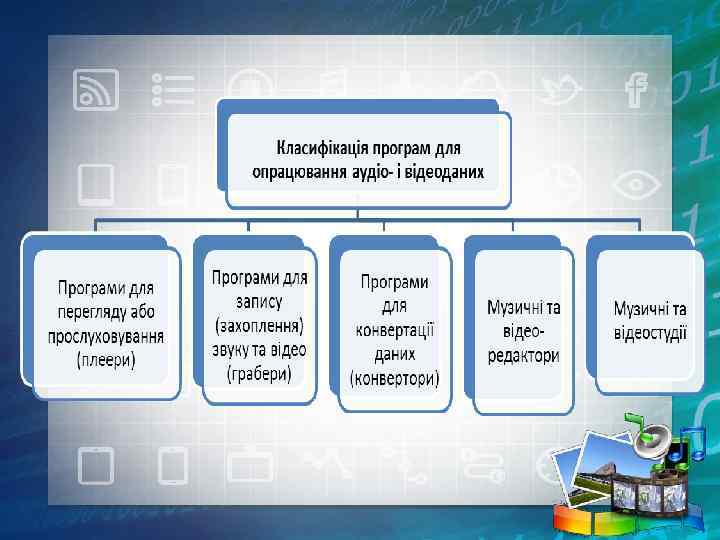 Практичне завдання Завдання 2. • Навести приклади програм для опрацювання аудіо- і відеоданих. Доповнити схему прикладами. Класифікація програм для опрацювання аудіо- і відеоданих Програми для перегляду або прослуховування (плеери) Програми для запису (захоплення) звуку та відео (грабери) Програми для конвертації даних (конвертори) Музичні та відеоредактори Музичні та відеостудії