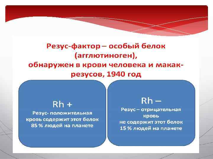 Резус-фактор представляет собой антиген (белок), который находится в эритроцитах. Примерно 80 -85% людей имеют его и соответственно являются резус-положительными. Те же, у кого его нет – резус-отрицательными. Учитывается и при переливании крови.