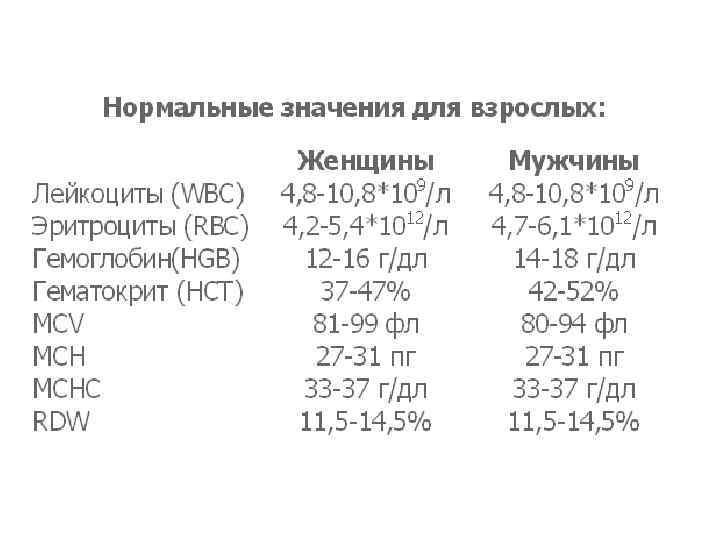 В крови здорового человека содержание гемоглобина составляет • 120— 165 г/л • 120— 150 г/л у женщин • 130— 160 г/л у мужчин • У беременных содержание гемоглобина может понижаться до 110 г/л.